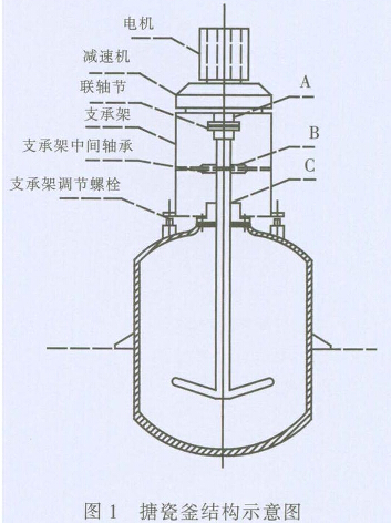 (4)設(shè)備整體找正找平。因?yàn)閷?shí)際上密封的安 裝基準(zhǔn)面是釜?dú)んw,而攪拌的安裝基準(zhǔn)面既有釜 殼體還有支架。就是說在整體安裝后,既要保證攪 拌和釜體的垂直對中,又要保證攪拌和密封的同 軸度,即從電機(jī)輸出軸端(聯(lián)軸節(jié)處)點(diǎn)A,到中間 支承軸承點(diǎn)B,再到密封中心點(diǎn)C,三點(diǎn)ABC為一 直線且垂直于水平面。參見圖1。